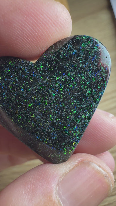 Matrix opal, like this piece, features opal interspersed within its host rock. To bring out its captivating colours, the opal undergoes a sugar treatment—a process where the stone is soaked in a sugar solution, then heated in acid to darken the matrix. This enhances the opal's natural brilliance, creating a stunning contrast that showcases its radiant hues. The result is a breathtaking gem that’s as unique as the landscape it hails from. Sugar treating is only done on Matrix opal.
