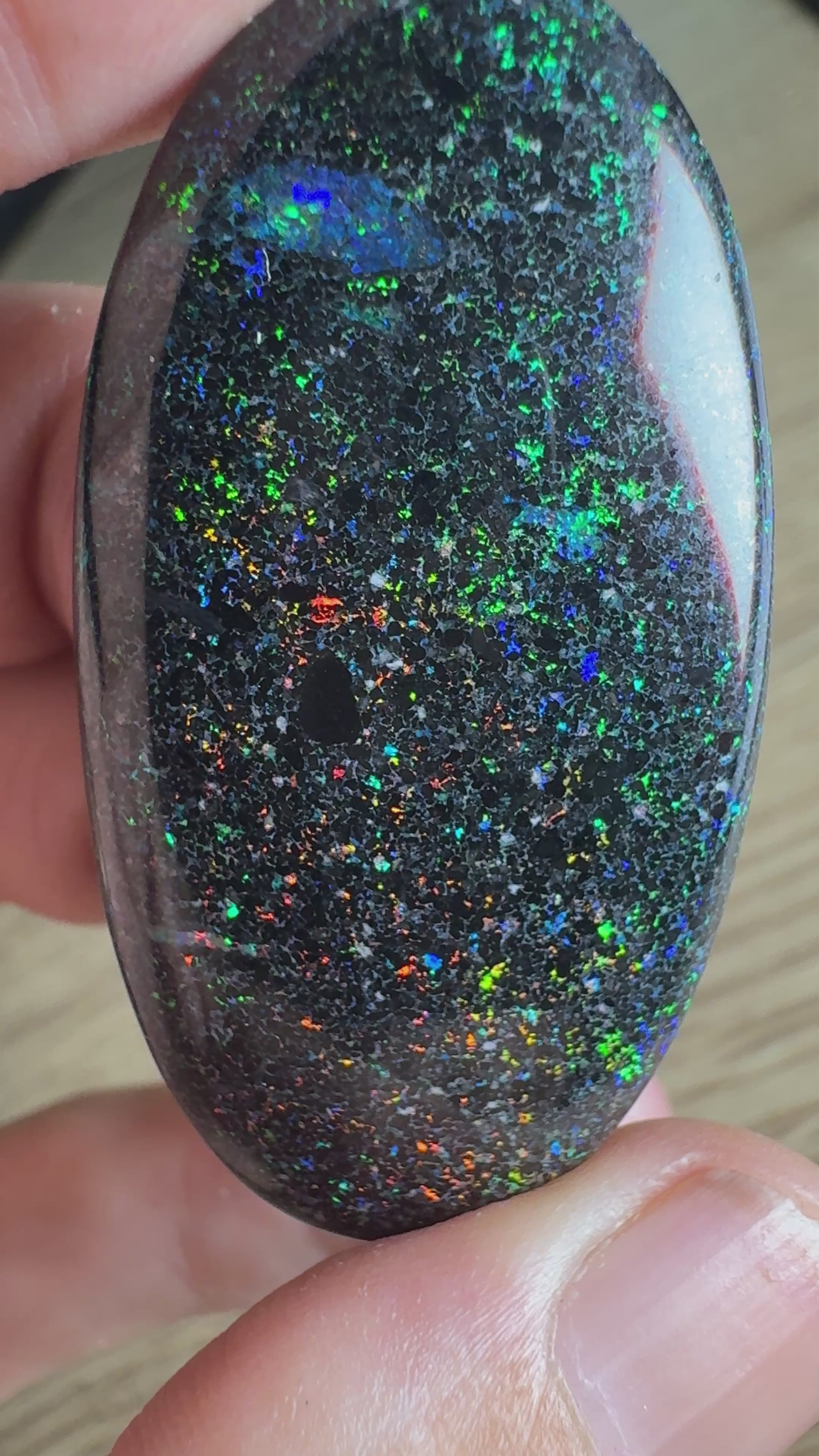 Matrix opal, like this piece, features opal interspersed within its host rock. To bring out its captivating colours, the opal undergoes a sugar treatment—a process where the stone is soaked in a sugar solution, then heated in acid to darken the matrix. This enhances the opal's natural brilliance, creating a stunning contrast that showcases its radiant hues. The result is a breathtaking gem that’s as unique as the landscape it hails from. Sugar treating is only done on Matrix opal.