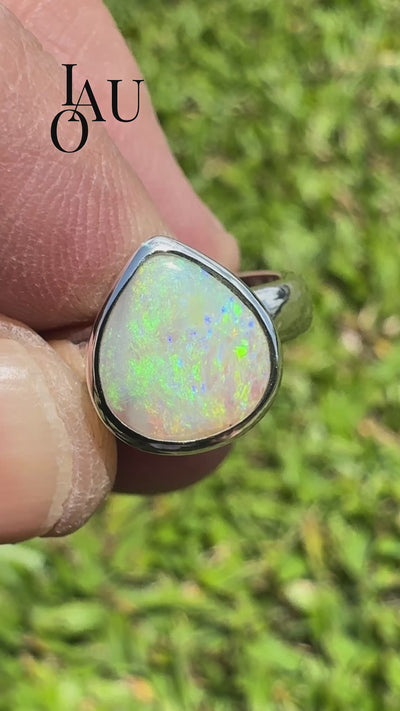 This hand-cut Lightning Ridge opal is set in a sleek sterling silver band, showcasing its beautiful play of colour. Each flash of green and blue captures the magic of natural opals, making this a unique piece of Australian craftsmanship.