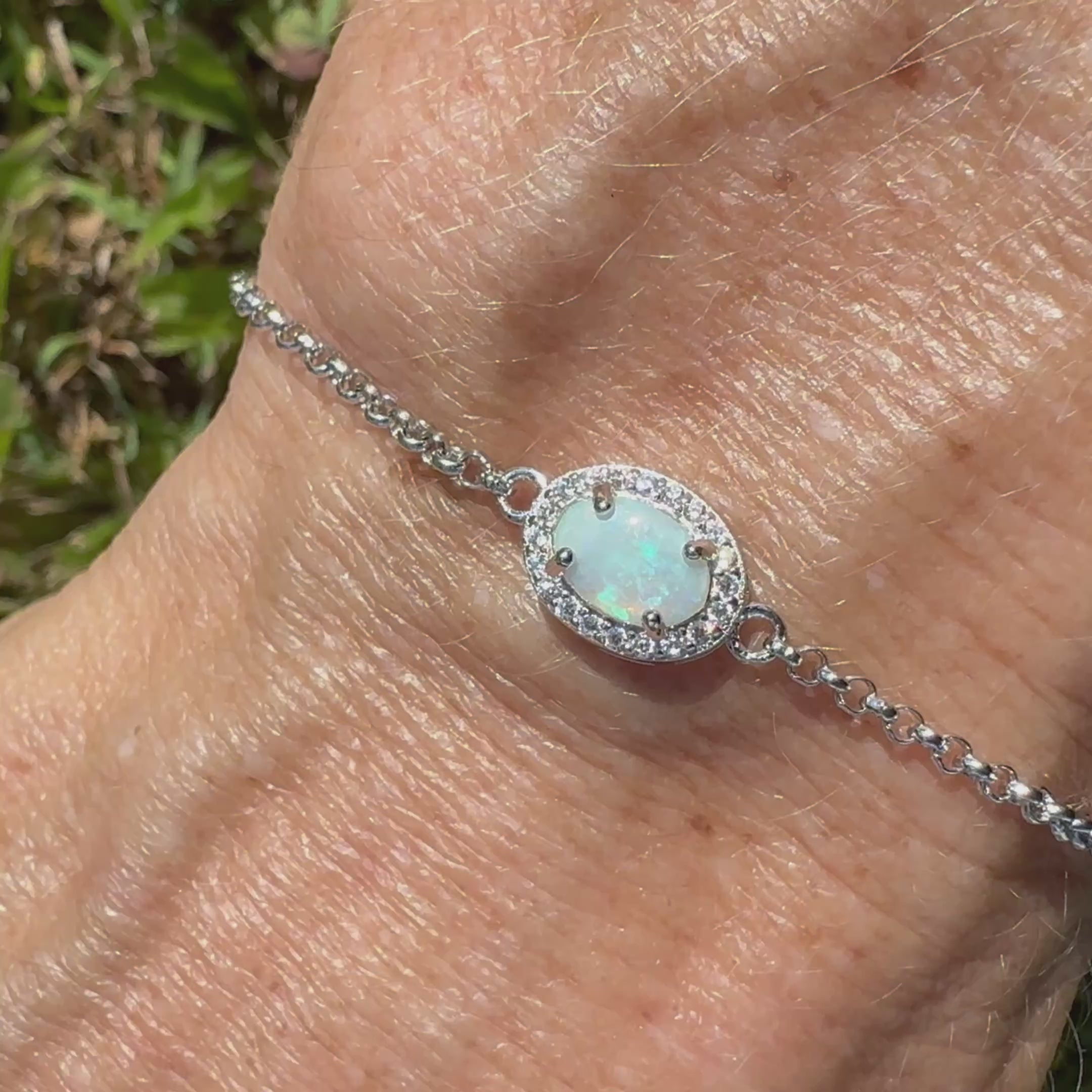 This bracelet features a beautiful Coober Pedy crystal opal set in a classic design, capturing the beautiful colours and play of light unique to this rare gemstone. The opal is carefully hand-cut to highlight its natural beauty, set in a cubic zirconia and sterling silver bracelet.