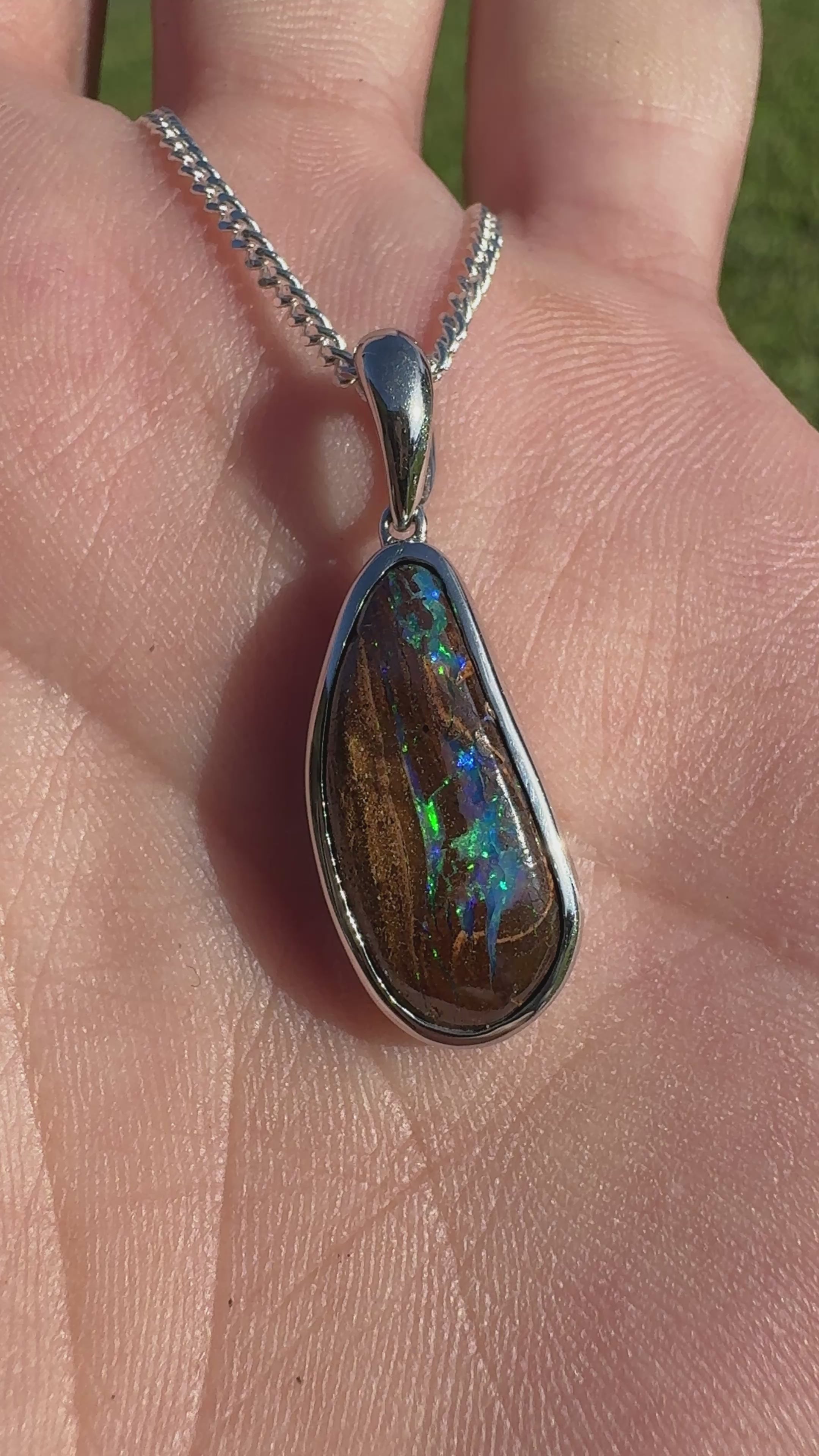 A striking Australian Boulder Opal pendant showcasing rich green flashes that dance across its natural earthy base, set in a smooth 925 sterling silver half-set bezel. This opal combines the raw beauty of nature with a refined, modern finish.