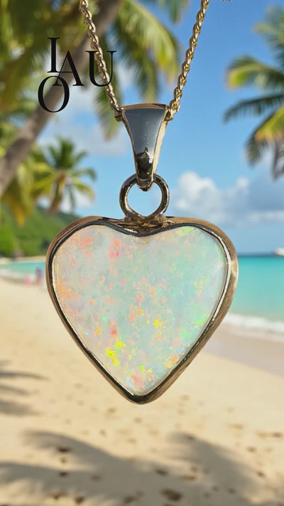 Showcasing a unique heart shaped opal with stunning rainbow colours, this piece captures the essence of the Australia's serene beauty.