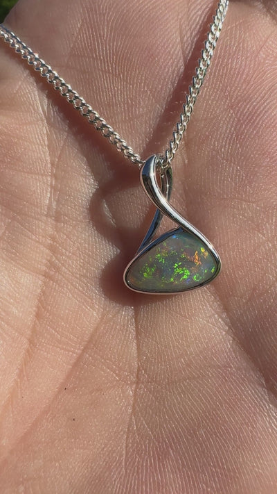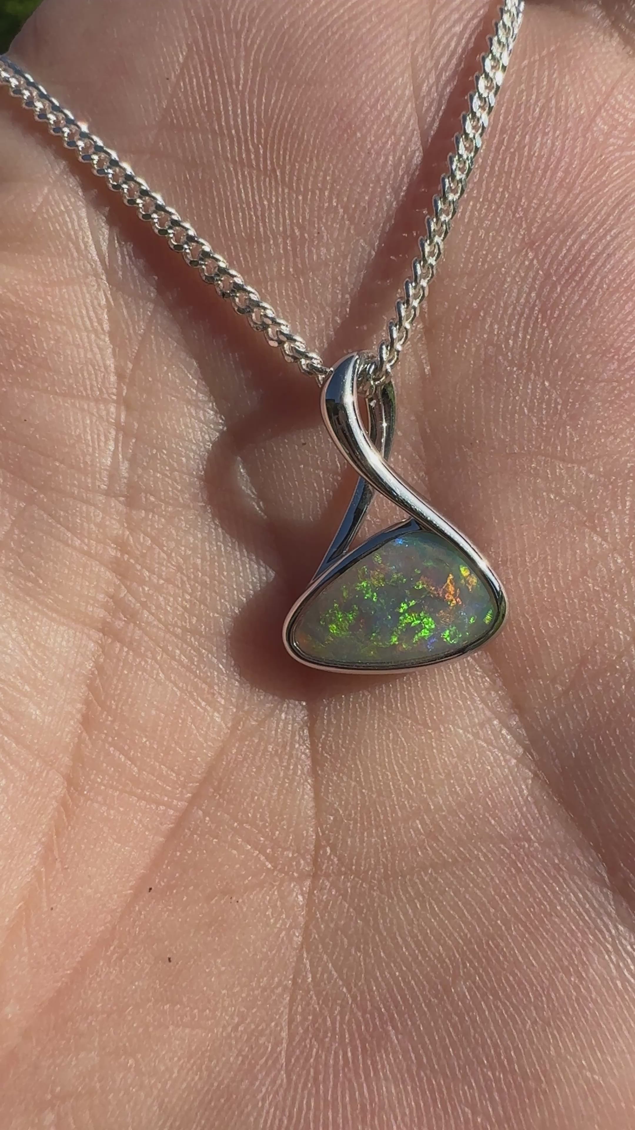 This natural Australian opal showcases a beautiful play of colour that shifts with every movement. Its elegant shape and cut enhance the opal’s brightness, creating a pendant that glows with a vibrant charm.