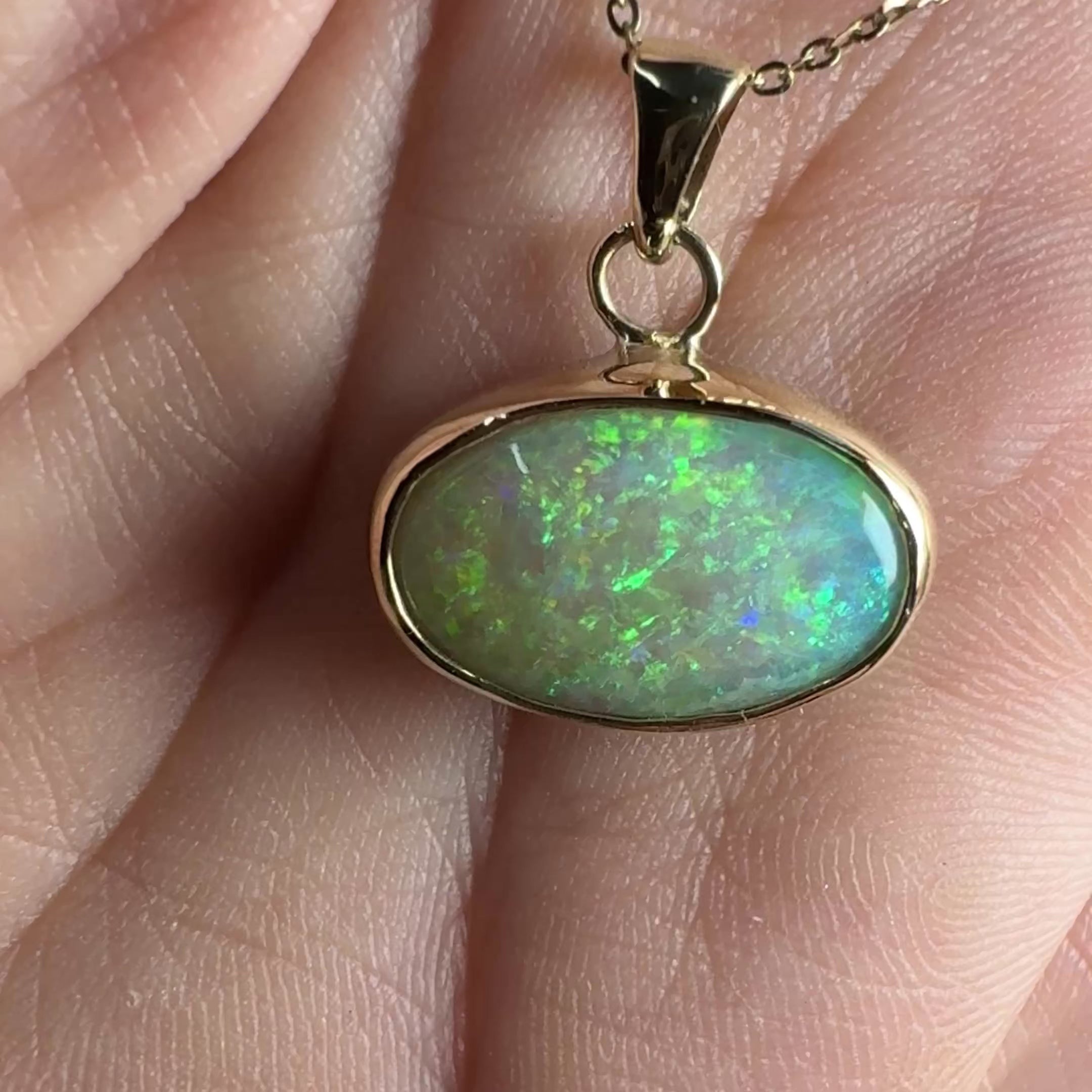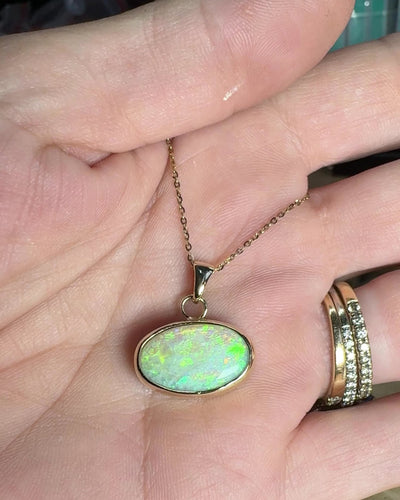 Hand-cut and hand-set in genuine Australian 9ct solid Gold, this pendant features a vibrant opal sourced from the renowned Lightning Ridge opal fields. As Australia's national gem, this opal embodies the vibrant and untamed spirit of the Australian landscape.