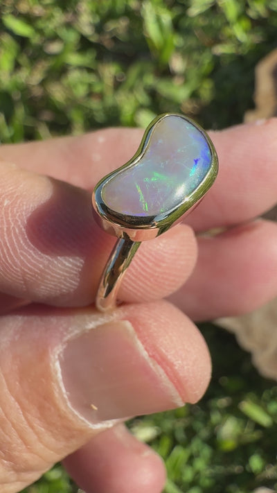 This hand-cut, Lightning Ridge Semi Black Opal is set in solid 9ct solid gold. The opal showcases beautiful colours. Sourced from the heart of the renowned Lightning Ridge opal fields, this gem captures the essence of Australia’s natural beauty.