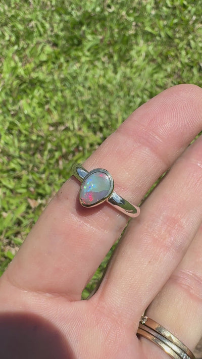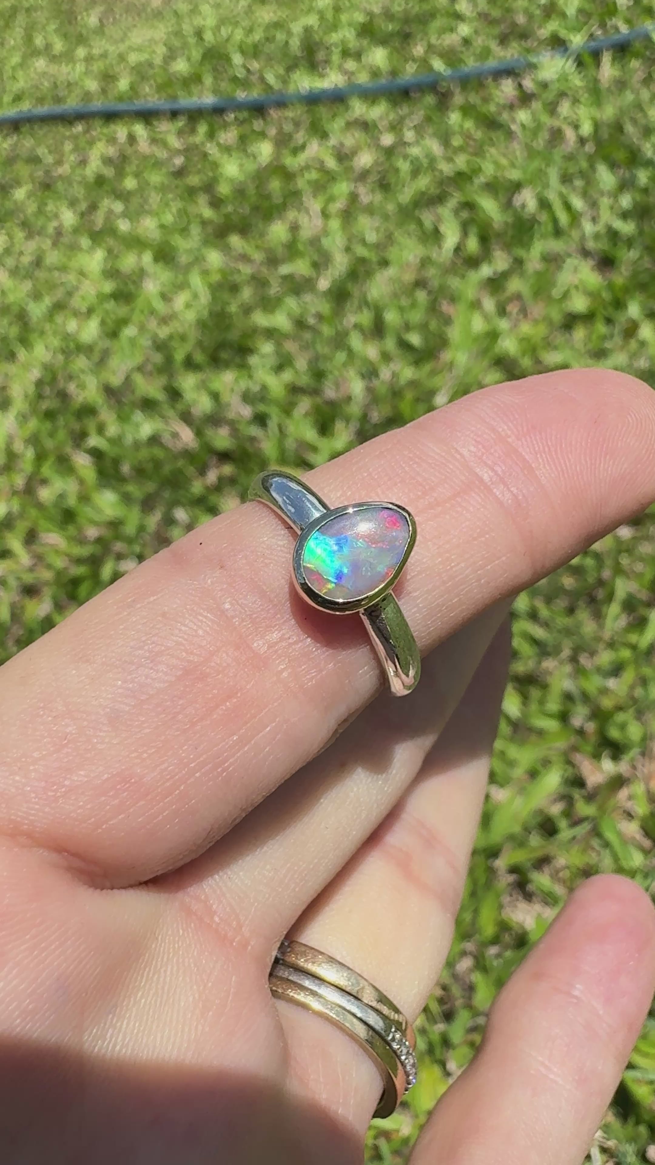 Adorn yourself with the timeless beauty of Australia with this handcrafted 0.6ct Solid Lightning Ridge Opal 9ct Gold Ring &925 Sterling Silver Ring.