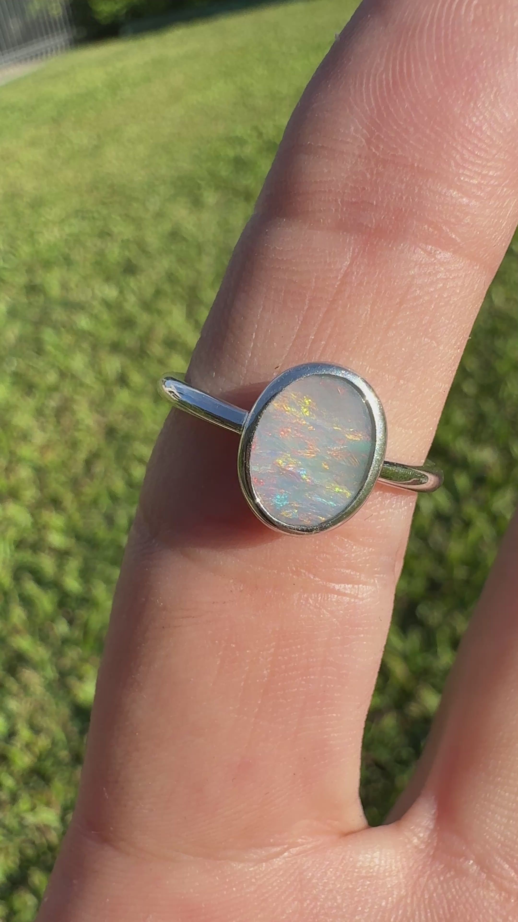 This natural Australian opal showcases a beautiful play of colour that shifts with every movement. Its elegant shape and cut enhance the opal’s brightness, creating a ring that glows with a vibrant charm.