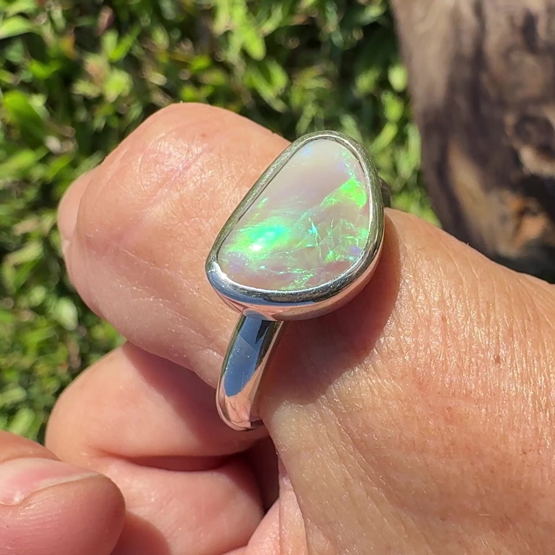 This natural Lightning Ridge Crystal opal is alive with vibrant flashes of green and blue, set in a solid silver band for a clean and contemporary look. Its bold oval cut enhances the opal’s depth, making it a captivating piece for everyday wear or special occasions.