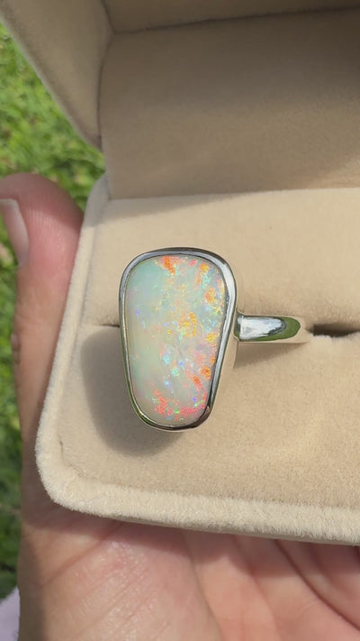This hand-cut, Coober Pedy Opal is set in a timeless sterling silver setting, showcasing beautiful red, blue, green, and orange colours. Sourced from the heart of the renowned Coober Pedy opal fields, this gem captures the essence of Australia’s rugged beauty.