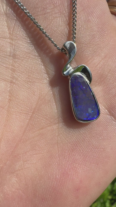 A striking Australian Boulder Opal pendant showcasing rich purples and blues that dance across its natural earthy base, set in a smooth 925 sterling silver bezel. This opal combines the raw beauty of nature with a refined, modern finish.