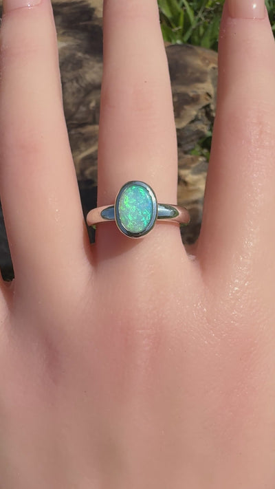 Hand-cut and bezel-set with care, this opal ring highlights the natural beauty of Lightning Ridge’s iconic stones. With its vibrant flashes of colour and classic silver setting, Ocean Bloom is a piece that carries both charm and Australian soul.