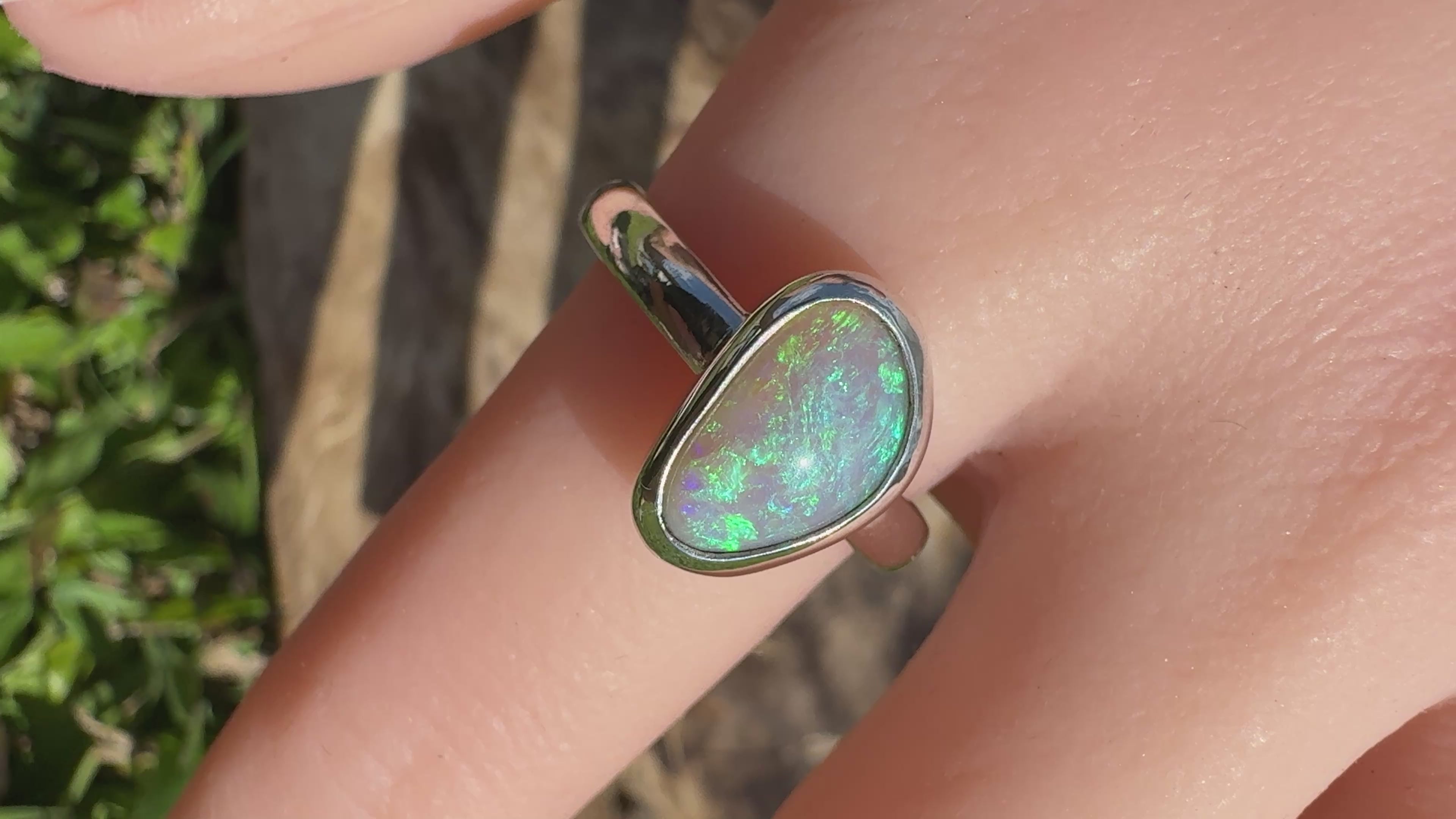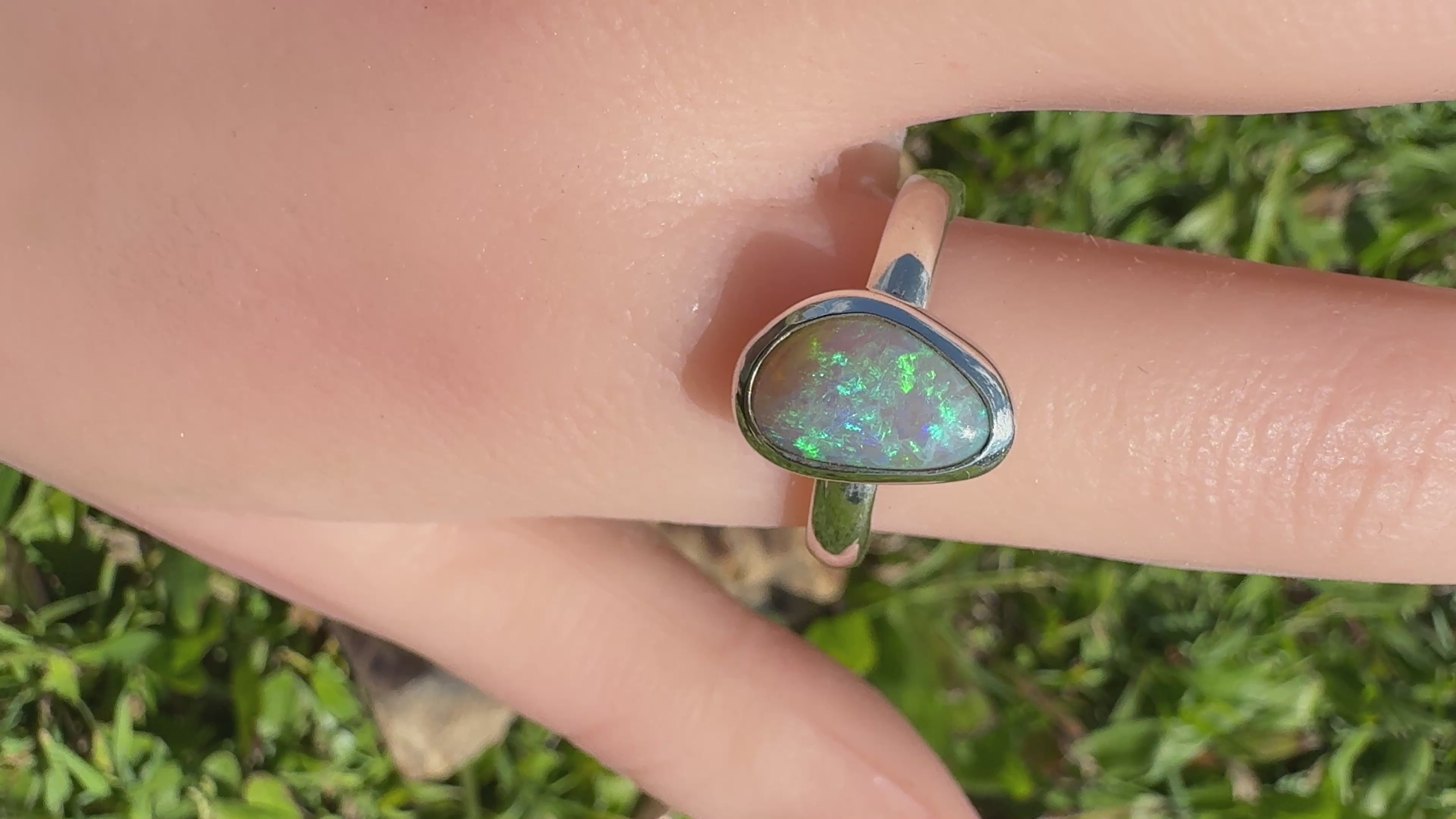 This hand-cut Lightning Ridge crystal opal is set in a sleek sterling silver band, showcasing its beautiful play of colour. Each flash of green and blue captures the magic of natural opals, making this a unique piece of Australian craftsmanship.