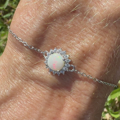 This bracelet features a beautiful Coober Pedy opal set in a classic design, capturing the vivid colours and play of light unique to this rare gemstone. The opal is carefully hand-cut to highlight its natural beauty, set in a cubic zirconia and sterling silver bracelet.
