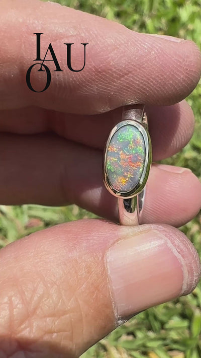 The Outback Blaze ~ With fiery reds and oranges that echo the Outback’s sunsets, this two-tone ring, crafted in 10k gold and 925 sterling silver, showcases the striking beauty of Lightning Ridge opal.