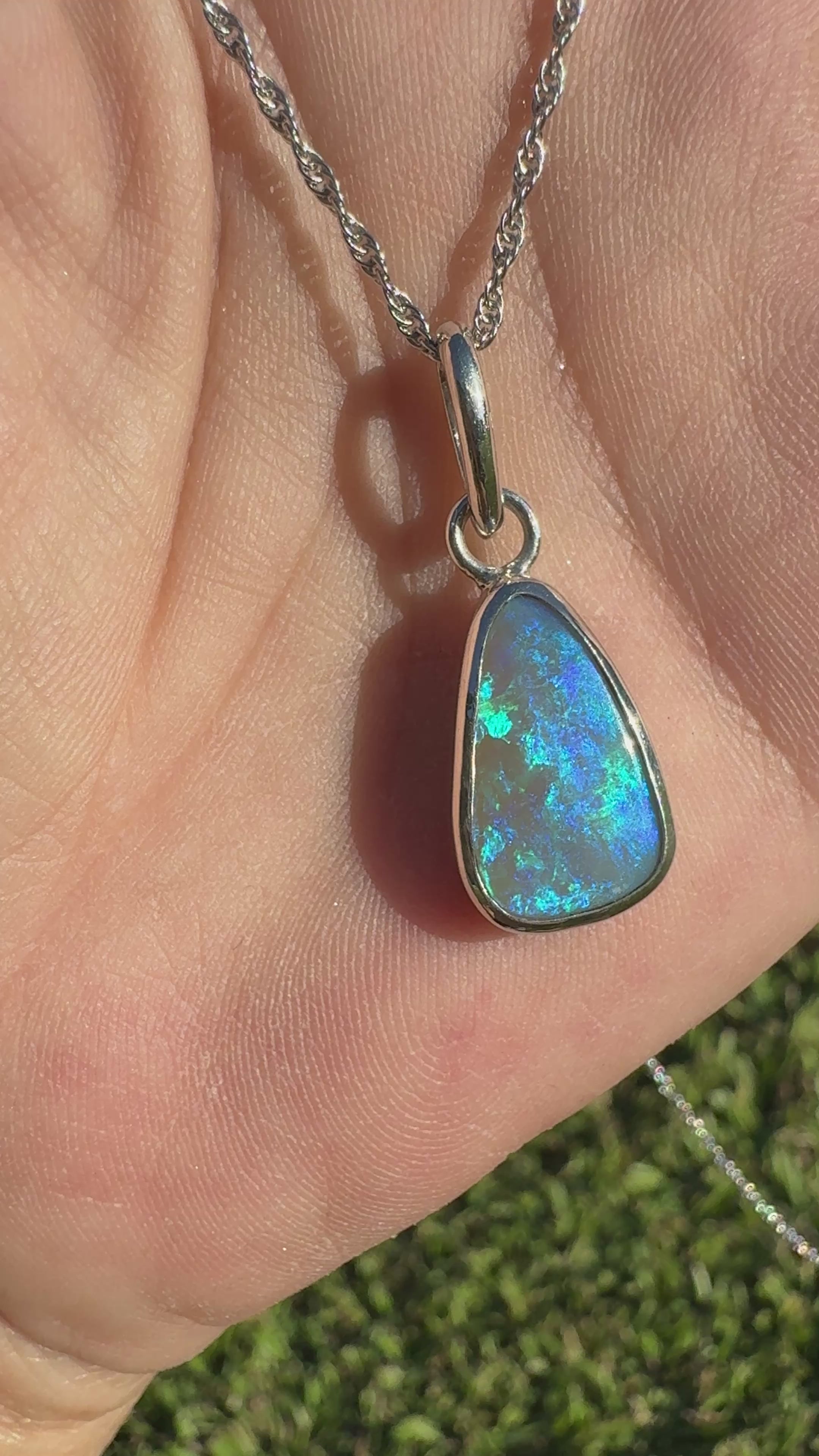 This natural Australian opal showcases a beautiful play of colour that shifts with every movement. Its elegant shape and dome cabochon cut enhance the opal’s brightness, creating a pendant that glows with a vibrant charm.